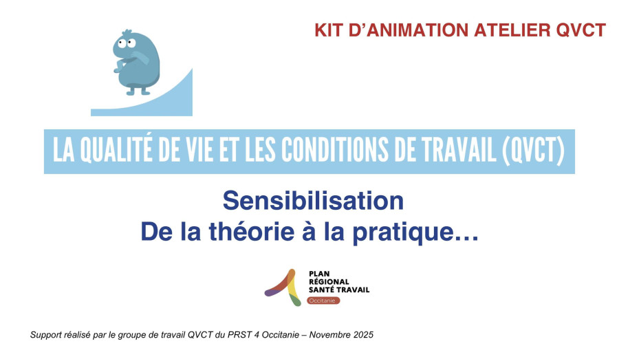 Ce kit a été expérimenté dans le cadre d'évènements du PRST Occitanie et vous propose plusieurs outils pour vous aider à organiser et animer des sessions de sensibilisation sur la qualité de vie et des conditions de travail (QVCT).